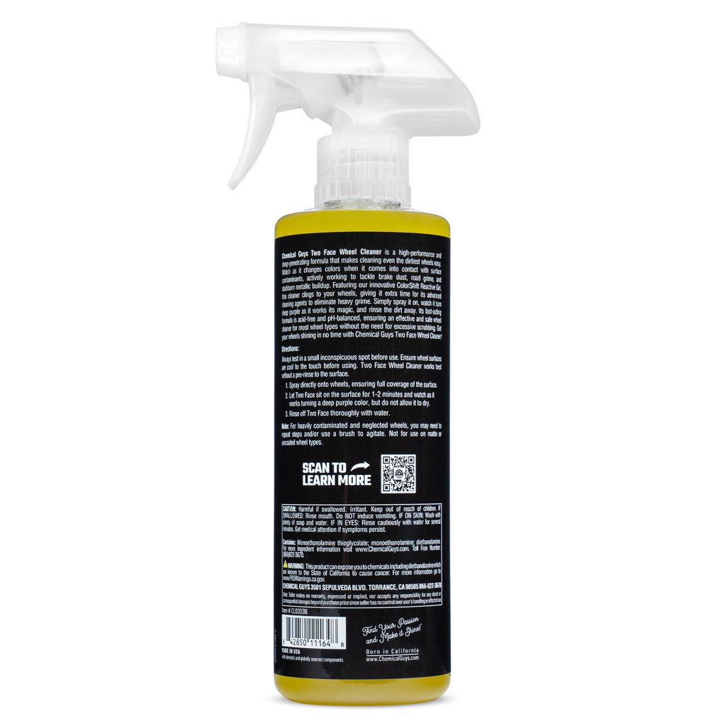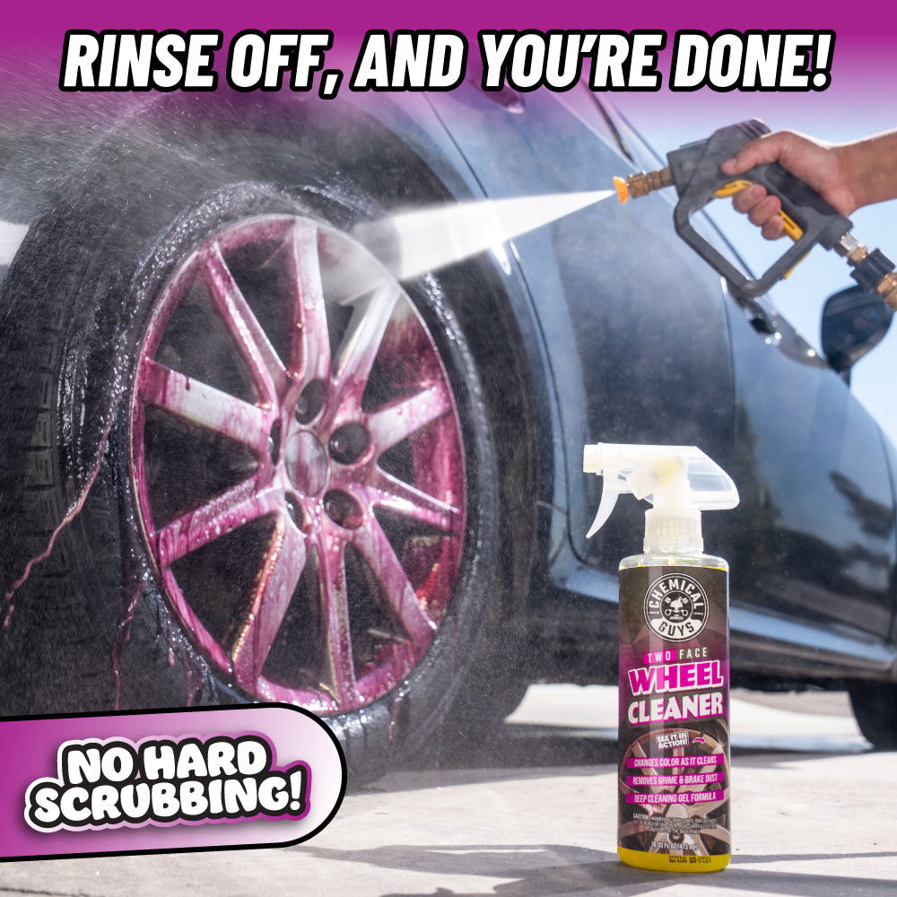 Two Face Color Changing Wheel Cleaner gör fälgrengöring både enkel och lite roligare. Den genomskinliga gelen sprayas på, fäster på ytan och byter färg till lila när den börjar jobba – så du ser exakt när det är dags att skölja av. Löser upp bromsdamm, järnpartiklar och annan smuts utan att du behöver skrubba ihjäl dig.